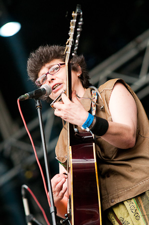 Naredni izvođač malo je presmiono postavljen na veliki T-Mobile stage gdje su pristizali prvi ranoranioci nakon jučerašnjeg hladnog i vjetrovitog tuluma. Beogradska odlična kantautorica BO (Bojana Bulatović) koja je, kako mi se čini, po prvi puta nastupila u Hrvatskoj možda je očekivala brojniju publiku i to onu koja je barem poslušala njen posljednji album "Kapetane gde si" (2008), ali nje nije bilo. Osobno znam jedno dvadesetak ljudi kojima se ona iznimno dopada, no nikoga od njih nisam primjetio... Bo je unatoč tome ostvarila pravi raritet kojem je prisustvovalo 50-tak promatrača - skurila je Marshall pojačalo akustičnom gitarom! Odmah je tu priskočila pomoć drugog pojačala, pa je koncert protekao bez ikakvih problema uz pratnju bubnjara Saše Furunovića i druge akustične gitare Rade Vulića, inače dvojca iz Popečitelja. Nisu imali bas, ali ovaj trojac je zvučao izuzetno glasno i kvalitetno, te sam se odmah podsjetio onog posmrtno tihog koncerta Bob Dylana u Varaždinu gdje je tri četvrtine publike zijevalo i svim silama načulilo uši da razaznaju o kojim pjesmama je riječ. Za razliku od Dylana, Bo je sa svojom akustarom, usnom harmonikom i sjajnim tekstovima odigrala odličnu jednosatnu partiju pokazavši kako jasan i glasan može biti unplugged session.