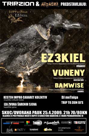 U subotu, 25. travnja u Zagrebu ćemo u jednoj večeri ugostiti dva vrlo respketabilna izvođača, francuski Ez3kiel koji su sa svojim dvanaestogodišnjim radom stekli mnoge poklonike diljem svijeta, i mostarski Vuneny koji su u vrlo kratko vrijeme odsvirali mnoštvo koncerata diljem Europe, te se se pokazali kao miljenici naše publike, a ovom će prilikom promovirati svoj novi album "Whatever singularity".