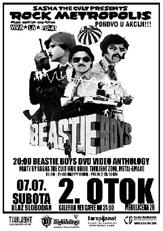 Ove subote (07/07) u 2. otoku (Medulićeva 28) od 20:00 h pogledajte projekciju Beastie Boys DVD-a ''Video Anthology''. U nastavku večeri, sve do 24:00 h, zabavljat će vas DJ Sasha the Cult (Fiju briju, Metal-Emajl, Twilight Zone).